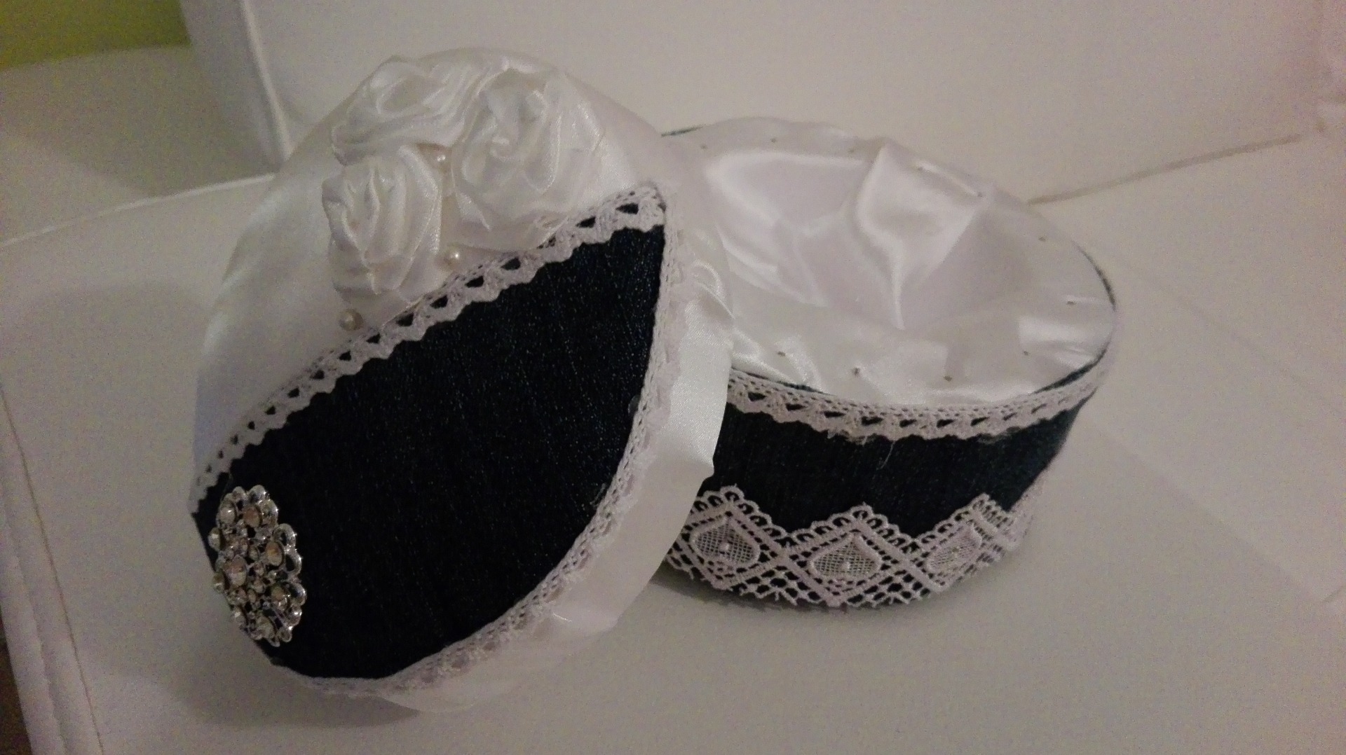 Určite to poznáte mnohé, keď vás nič nebaví, všetko je nuda. Ja som to zažila prednedávnom ešte keď som bola tehotná. Vonku pršalo, vo vnútri som mala poupratované, televízor sa mi pozerať nechcelo. Mala som túžbu niečo vytvoriť, niečo čo nie je okukané, čo by bola realzácia môjho nápadu a nie nápadu okopírovaného z internetu. Našla som v mojej zázračnej skrinke polystyrénovú krabičku. Už v zime som začala s patchworkom - teda s vajíčkami zo stužiek a špendlíkov. Lenže časovo je to neskutočne náročné a takáto krabička trvá aj 6 hodín, keď ju chcem urobiť poriadne. Chcelo to niečo jednoduchšie. Zobrala som si teda staré rifle a začala som. Vystrihla som si rifle v kombinácii s bielym saténom do požadovaného tvaru, oblepila som ním krabičku, navrch som pripevnila bielu krajku a na vrchnák brošňu a ručne robené saténové ruže a dozdobila korálkami. Šperkovnička alebo ak chcete okrasná krabička je na svete. Táto urobila radosť kamoške Monike :)